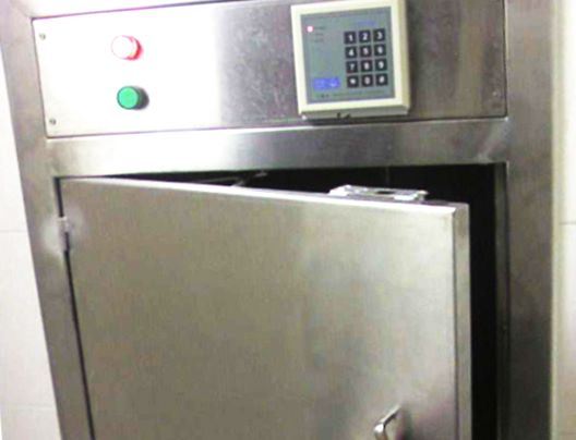3. 投物口有較大的傾角,有利于污物順利滑入污衣槽的槽身。投物門、檢修門都是雙層防火門,防火能力為1.5小時(shí)。投物門裝有閉門器,自動開關(guān)時(shí)平緩無噪聲。門旁的電 控門鎖由PLC控制,確保污衣槽在運(yùn)行過程中,同一時(shí)間只有一個(gè)投物門能被打開。由于污物出口沒有阻物門,使系統(tǒng)形成一個(gè)相對的封閉的空間,消減投物產(chǎn)生 的噪聲。污物出口設(shè)有防火門,發(fā)生火災(zāi)時(shí),可阻止火勢的漫延。同時(shí)消防噴淋頭啟動,進(jìn)行滅火。每層都有固定臺架,把污衣槽堅(jiān)固在地臺或墻上。